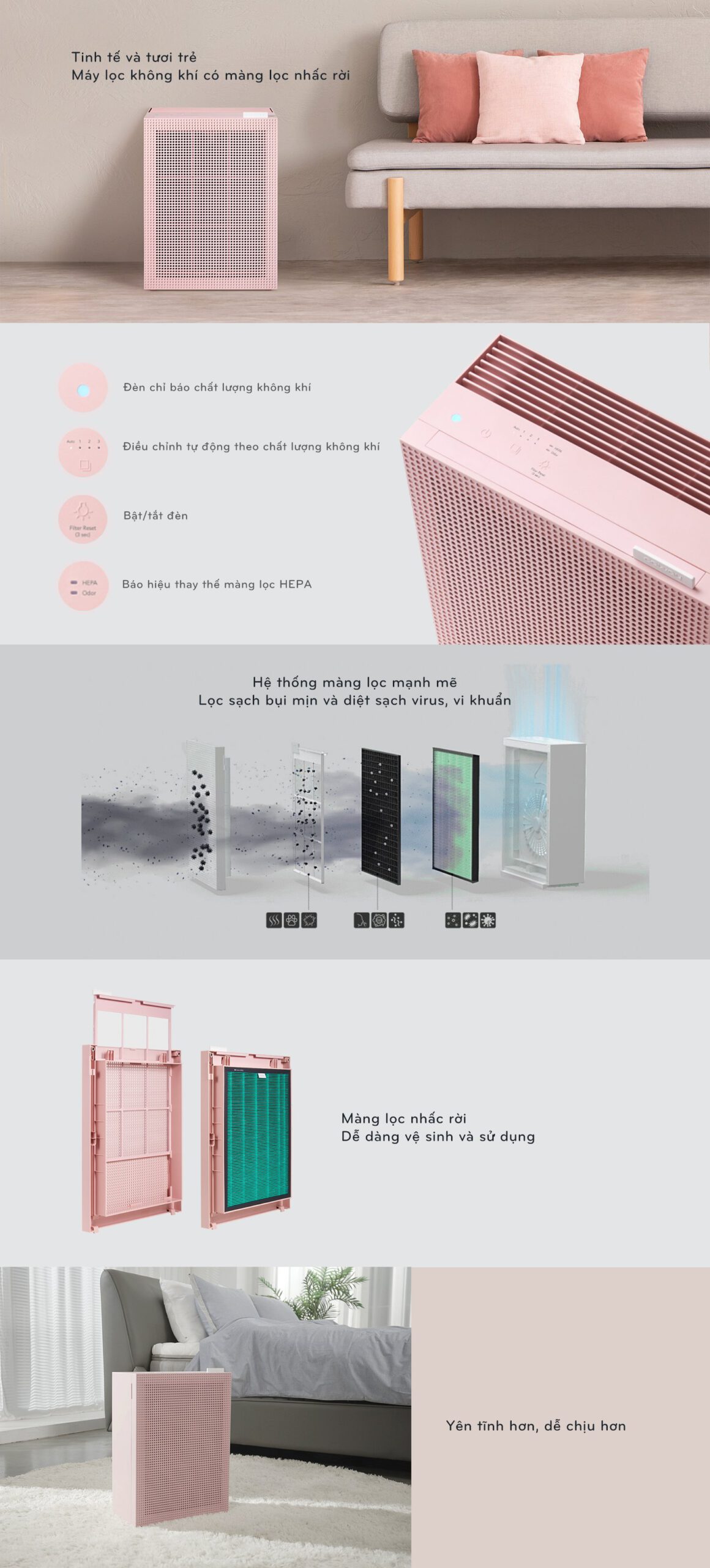 - Hệ thống lọc bụi mạnh mẽ với 3 bước lọc có khả năng làm sạch không gian với diện tích đến 33m²