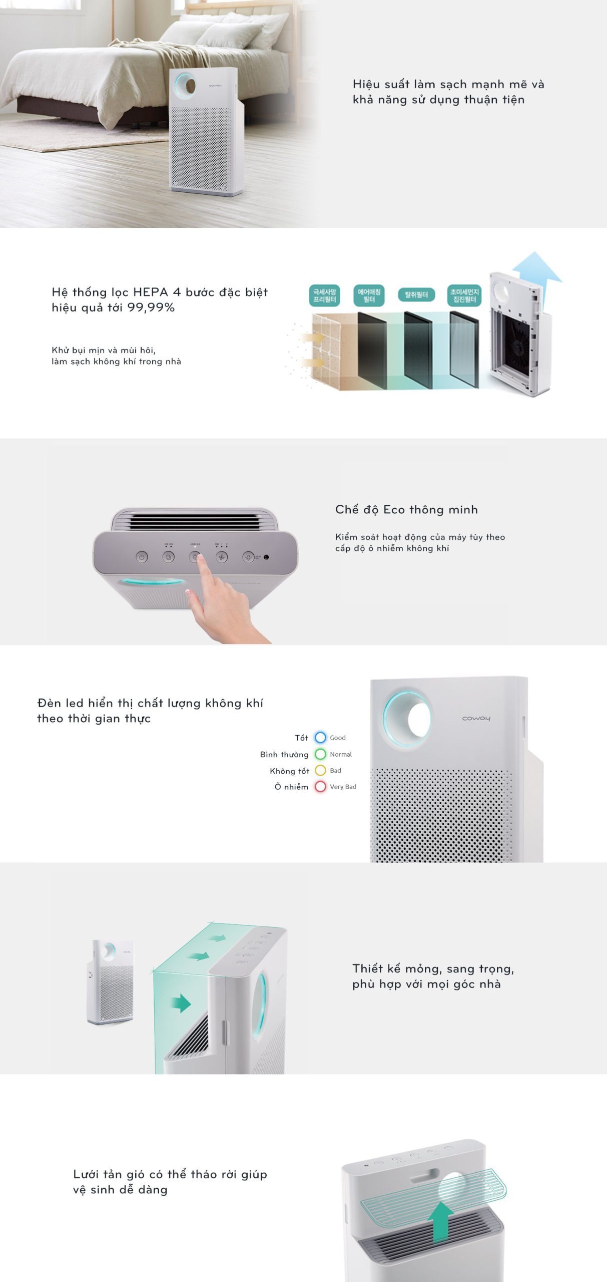 - Vệ sinh dễ dàng với lưới thoát khí có thể tháo rời và hệ thống báo thay màng khi đến hạn tiện lợi