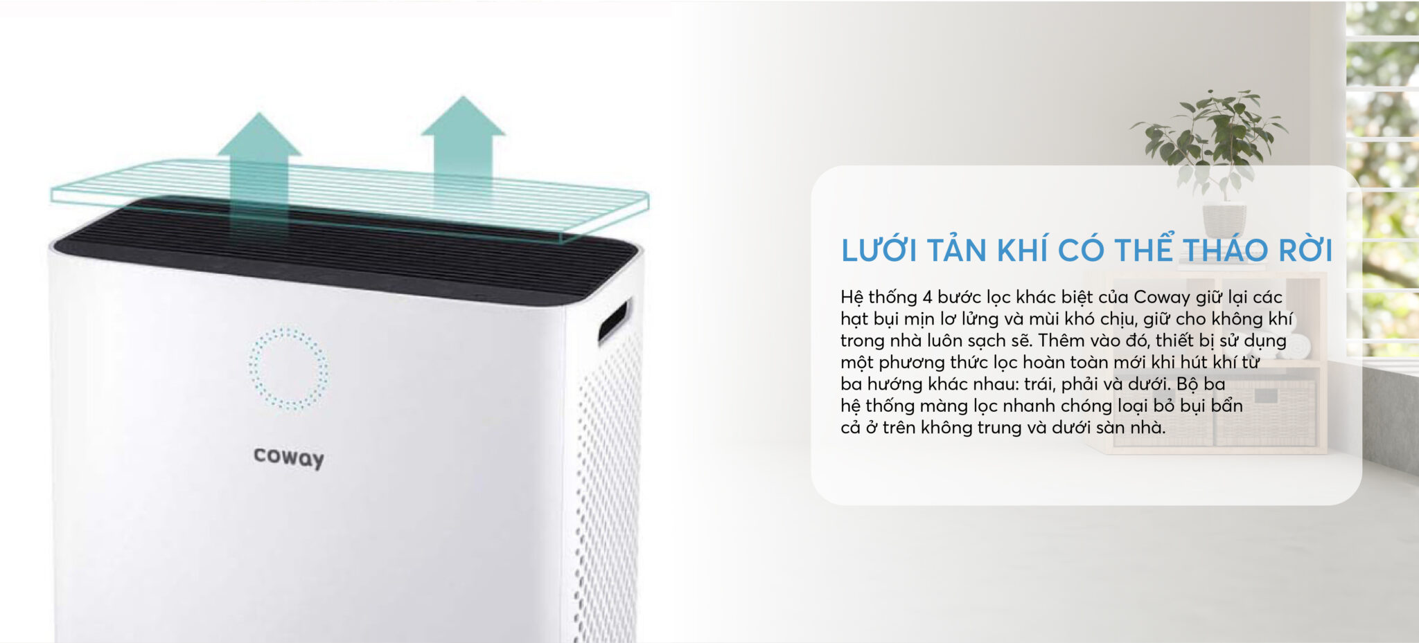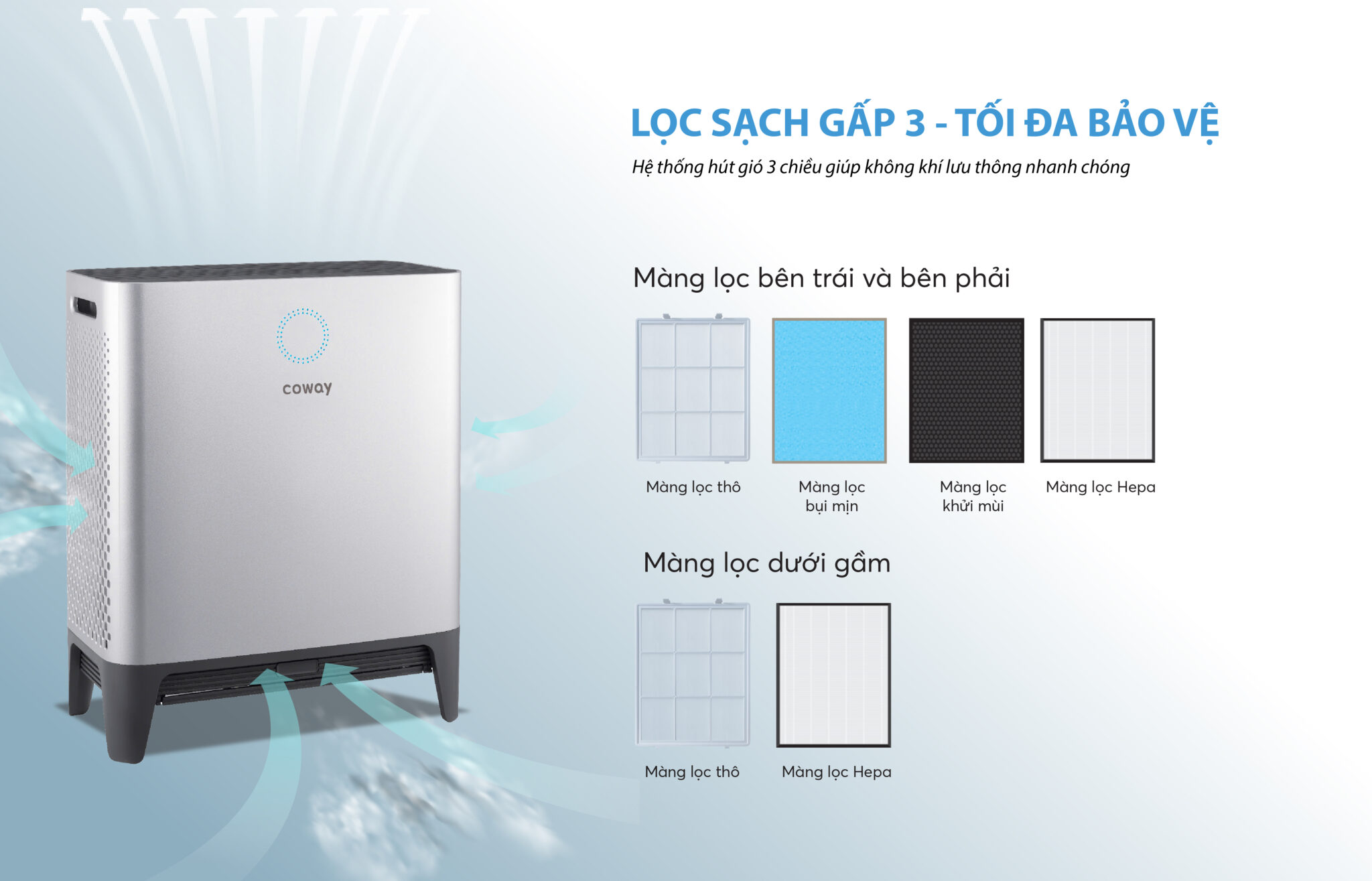 - Hút khí từ ba hướng khác nhau: trái, phải và dưới, giữ lại bụi bẩn bay lửng lơ trong không khí và trên sàn nhà
