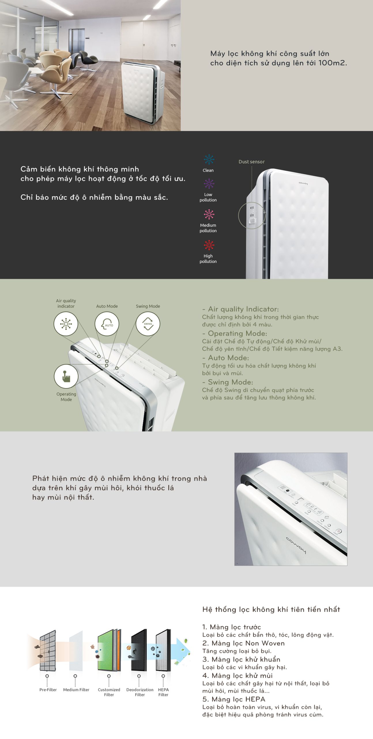 - Hệ thống lọc không khí 5 bước với màng lọc HEPA tân tiến